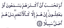 Commentary: Cattle do not know whether they are being driven towards a pasture or a slaughter house. The same is true of most people: they continue moving ahead under the influence of the satan within them - the satan of desire - and under the influence of their leaders who are wont to misguide them so that they do not know whether they are being driven towards their success or destruction. Woe to such people, for unlike the cattle, they have been endowed with reason and the ability to think and judge for themselves. Hence, their state is worse than that of cattle. Let it be clear that this verse is not meant for the Prophet, peace be upon him, or the believers for if it were it would mean that the Prophet and the believers were being asked to desist in their effort to convey their Message to the unbelievers. Rather, the verse is meant for the unbelievers. It asks the unbelievers to waken from their state of negligence and heedlessness and to change their ways which are like those of dumb driven cattle. This they should do for they have been endowed with the ability to think and to reason. [Compiled from "Towards Understanding the Quran" by Sayyid Abul Ala Mawdudi, Vol 7. p. 28] |