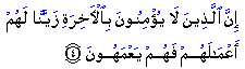This is the Law of Nature devised by God. Such is human psychology that when a man thinks that the results of the struggle in this life are limited to this world only, when he is not convinced that there is another Court of Law in which the whole of his life will be judged and a final verdict passed on his performance, when he is not sure that there will be another life following the present one - a life wherein he will receive the true measure of reward and punishment in consideration of his deeds - he is bound to develop a materialistic worldview. All discussion concerning the conflict between Truth and falsehood, between God's Unity and polytheism, between good and evil, and between morality and immorality appear to him as meaningless. Whatever can bring him pleasure, enjoyment, material betterment and luxuriant living, and whatever can endow him with power and authority will seem good to him, regardless of all moral and philosophical considerations. His only goal will be the pursuit of worldly advantage and this will make him wander around in every direction. Seized with this behaviour, a man's evil deeds become attractive and charming. Making evil deeds attractive is sometimes attributed to God and sometimes to Satan. When it is attributed to God, it means, as in the above context, that whoever accepts such an attitude to life, naturally becomes infatuated with it. By contrast, when it is attributed to Satan, it means that Satan presents those people who subscribe to a materialistic worldview with an imaginary picture of a seductive heaven and continually prods him, saying: "Go ahead, you are doing well." (see for instance Surah Al-Ankabut 29: 38) Source: |