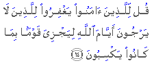"Tell those who believe, to forgive those who do not look forward to the Days of God: It is for Him to recompense (for good or ill) each People according to what they have earned."