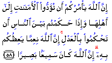 "Allah commands you to render back your Trusts to those to whom they are due; and when you judge between man and man, that you judge with justice: verily how excellent is the teaching which He gives you! For Allah is He Who hears and sees all things."