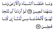 "Not for (idle) sport did We create the heavens and the earth and all that lies between the two. If it had been Our Will to find a pastime, We would have found one near at hand, if We were inclined to do so!"