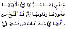 By the soul in the body (al-nafs) and what has balanced it (given it form) and inspired [both] its licentiousness and its intimate sense of God (its piety). He who purifies it will certainly be happy and he who corrupts it will certainly be lost (crushed).
