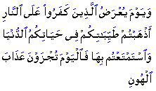 "The unbelievers shall one day be brought before the fire of hell and be told, 'You have squandered away the good things in your worldly life and enjoyed them to the full and today you shall be rewarded with ignominious punishment...'"