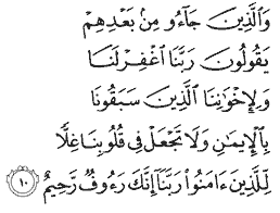 "Those who come after them pray: 'Our Lord! Forgive us and forgive our brethren who preceded us in faith. Leave no malice in our hearts towards those who believe. Lord, You are compassionate, ever merciful."