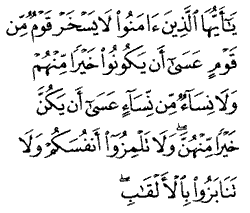 "O you who believe, do not let people mock another people; for it may be that these are better than them; nor should women mock other women, for it may be that these are better than them. And do not taunt one another nor insult each other with nicknames."