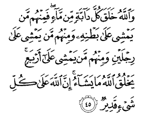 "God has created every animal from water; and among them are such as creep on their bellies, and such as walk on two legs, and others yet on four. God creates what He wills. Surely God has power over all things."