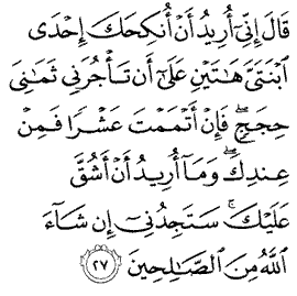 "[The father] said: 'I will give you one of these two daughters of mine in marriage on the understanding that you will remain eight years in my service. If you should complete ten years, it will be of your own choice. I do not wish to impose any hardship on you. You will find me, if God so wills, an upright man.'"